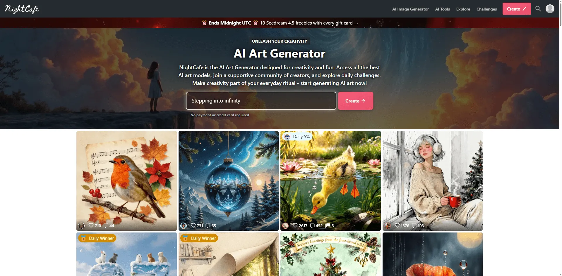 | NightCafe | Community & styles | $6/mo | 5 credits/day | 16+ algorithms |