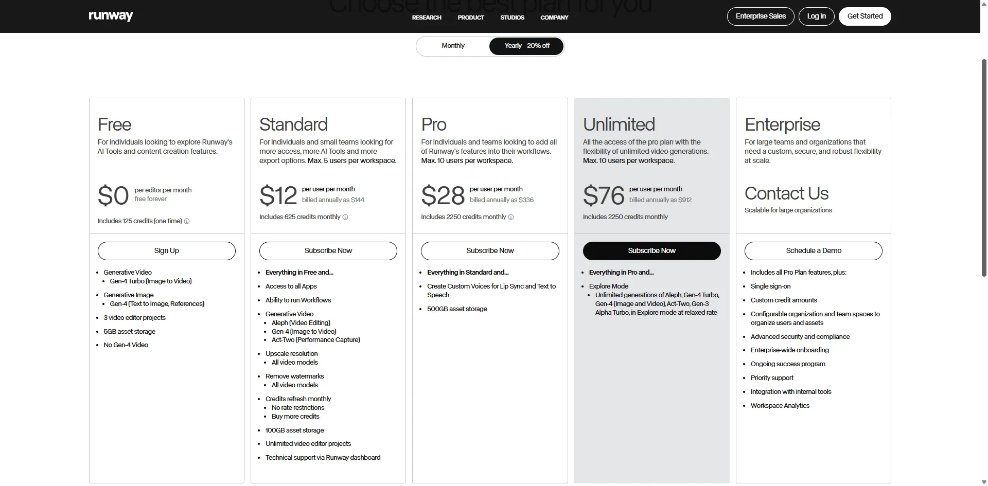 - Standard: $12/month (625 credits ≈ 52 seconds Gen 4 video)