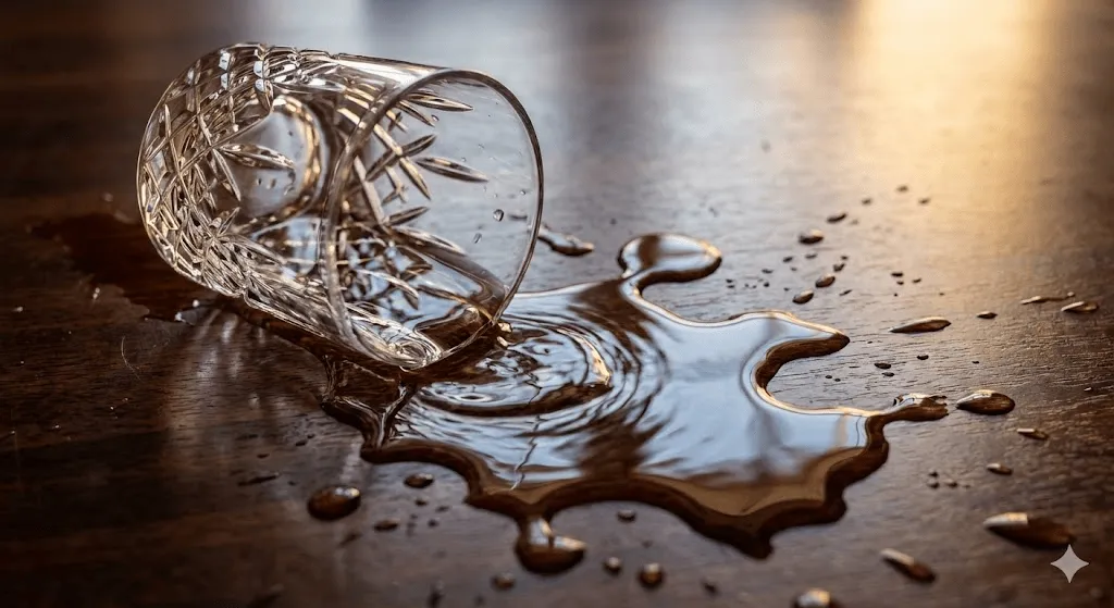 - 提示詞:「玻璃杯在木桌上翻倒」